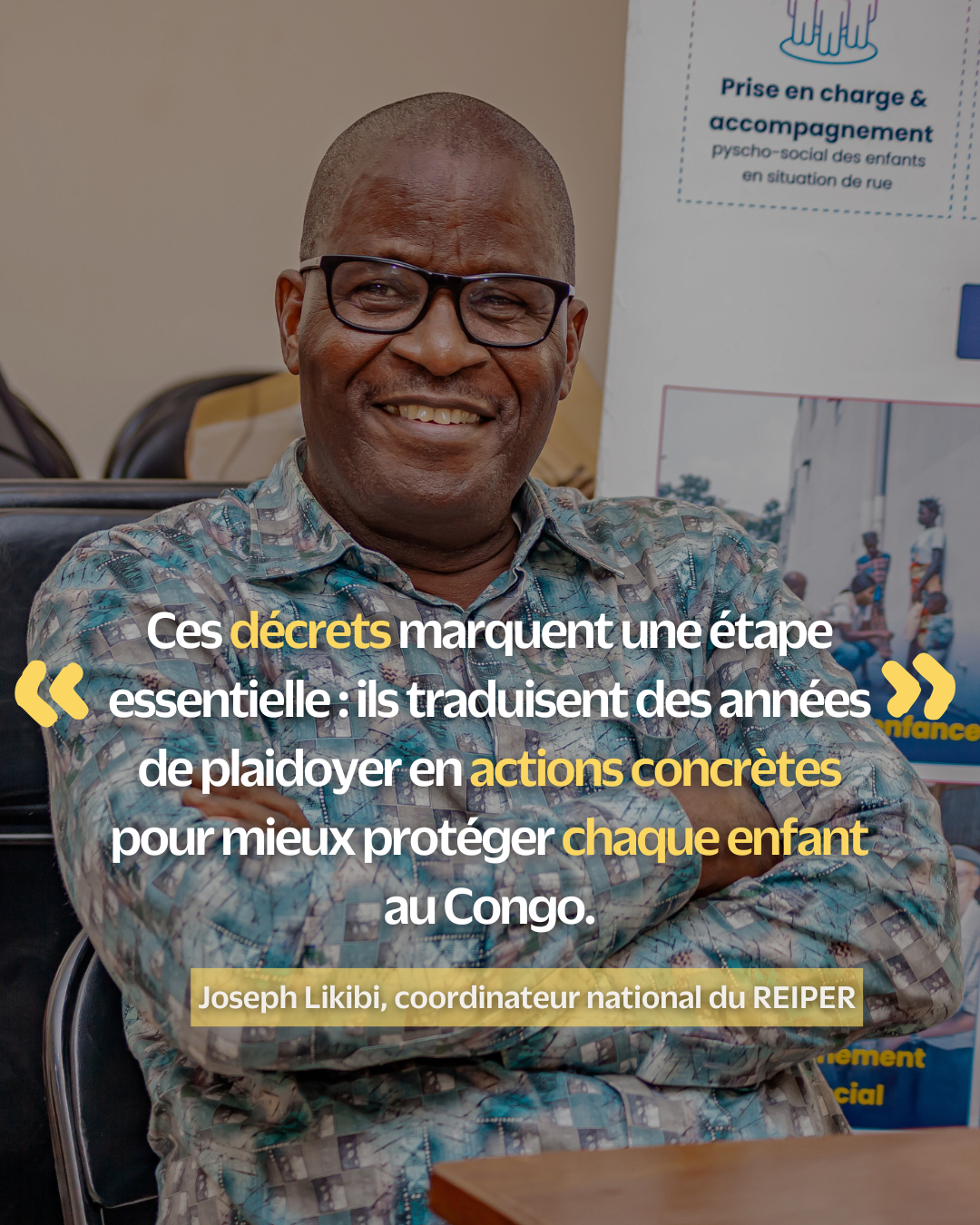 Une avancée majeure pour les droits de l’enfant, qui vient concrétiser nos années d’efforts de plaidoyer au Congo, menés aux cotés de notre partenaire le REIPER (Réseau des Intervenants sur le Phénomène des Enfants en Rupture) et en collaboration avec l’UNICEF.